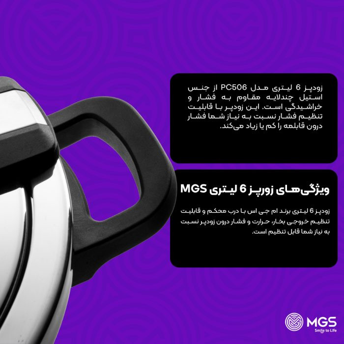 زودپز 6 لیتری برند ام جی اس با درب محکم و قابلیت تنظیم خروجی بخار، حرارت و فشار درون زودپر نسبت به نیاز شما قابل تنظیم است.