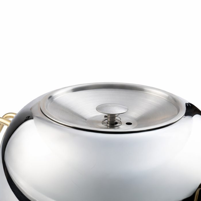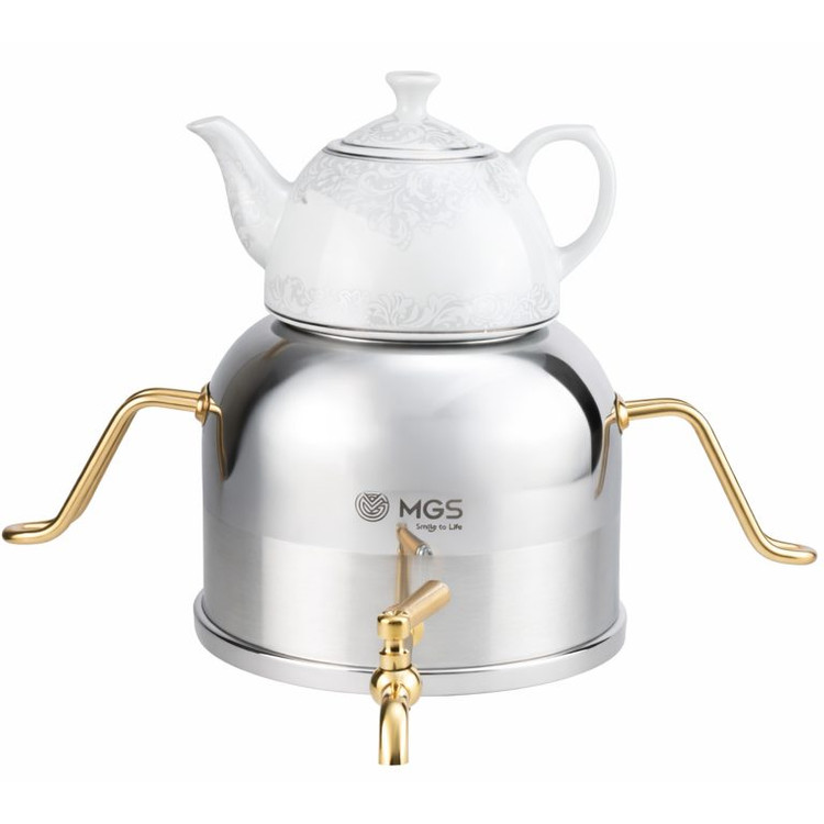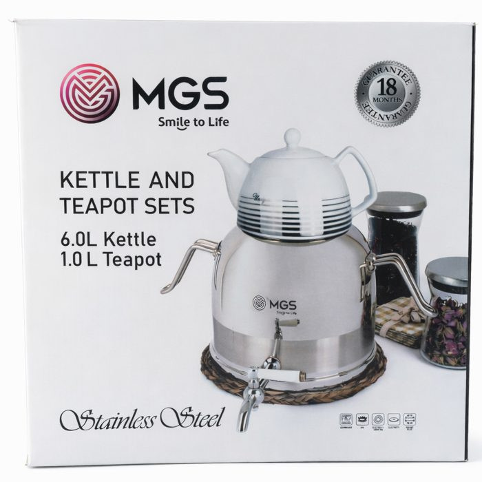 بدنه کتری 6 لیتری ام جی اس از جنس استیل ضد زنگ و مقاوم در برابر ضربه است. دسته این کتری نیز از جنس استیل میباشد. گنجایش قوری این ست 1 لیتر است.