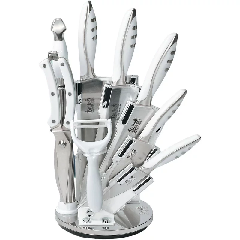 دارای : 4عدد کارد در طرح های متفاوت / 1عدد ساطور / 1 عدد پوست کن / 1 عدد قیچی / 1 عدد کارد تیزکن / 1 عدد پایه