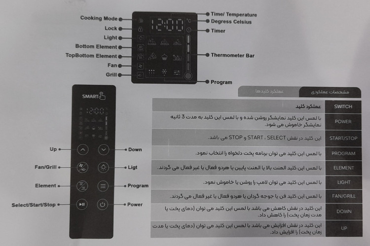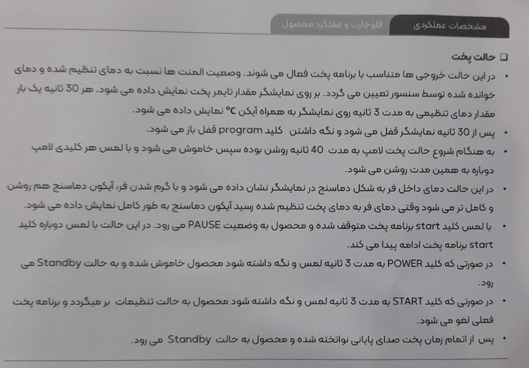 برنامه های پخت : MANUAL / SELF CLEAN / یخ زدایی / کیک / پیتزا / ماهی / گوشت / مرغ