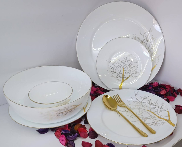 سرویس 26 پارچه گلدن اپال طرح درختی طلایی در قالب بن چاینا با بهترین کیفیت و شفافیت به بازار به عنوان جدیدترین طرح آمده است.