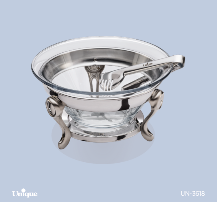 یکی از پرکاربردترین وسایل پذیرایی در جشنها و مراسم ها، سوفله خوری استیل پایه دار است. سوفله سالادخوری با انبر نگین دار نقره ای یونیک کد 3618 برای سرو انواع سالاد و پیش غذا است . کاسه شیشه ای این محصول ساخت فرانسه و مقاوم در برابر ضربه است این کاسه بر روی یک پایه از جنس استیل ضد زنگ قرار می گیرد. همچنین برای سرو پیش غذا یک قاشق و چنگال مخصوص بر روی این ظرف قرار گرفته است . طراحی لوکس این ظرف مناسب مهمانی های شماست.
