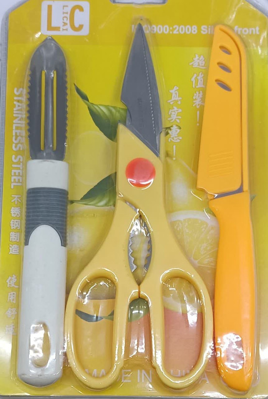 ست 3 پارچه آشپزخانه شامل چاقو غلاف دار . پوست کن . قیچی آشپزخانه بسیار با کیفیت و جدید در فروشگاه ملیکا موجود شد.