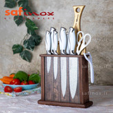 دارای 4 طرح کارد - 1عدد ساطور - 1عدد چاقو تیز کن - 1عدد قیچی - 1عدد پوست کن - 1عدد تخته گوشت - 1عدد استند