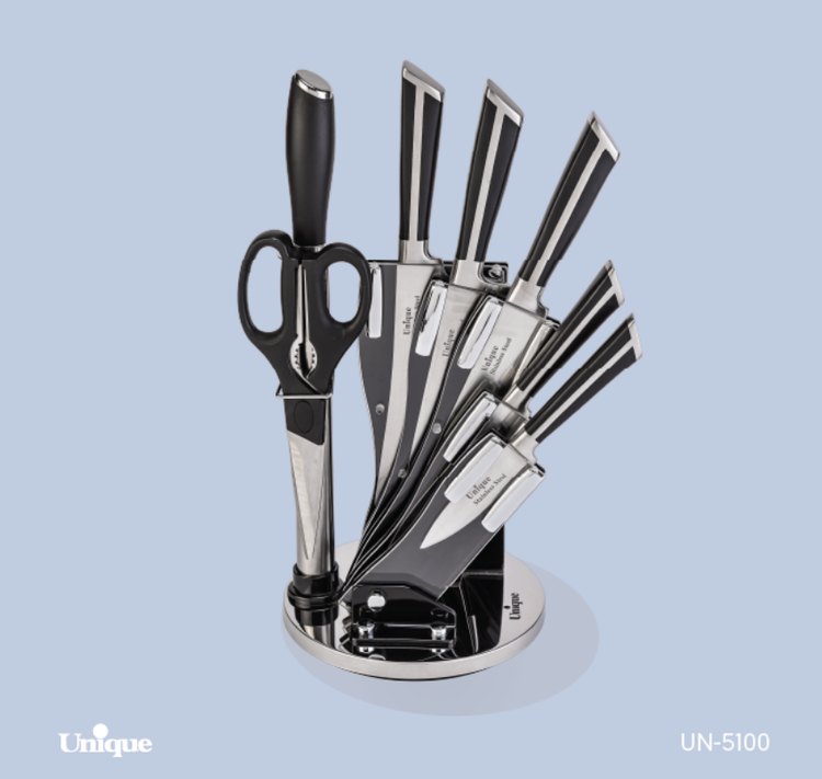 سرویس کارد 8 پارچه گردان یونیک مدلUN5100 یکی از ابزار های مهم آشپزخانه است که در رنگ استیل تولید و به بازار عرضه می گردد. این سرویس 8 پارچه شامل یک پایه از جنس پلاستیک، یک قیچی، یک ساطور، یک چاقوی سرآشپز، یک چاقوی برش نان، یک چاقوی بزرگ، یک چاقوی کوچک و یک تیز کننده می باشد