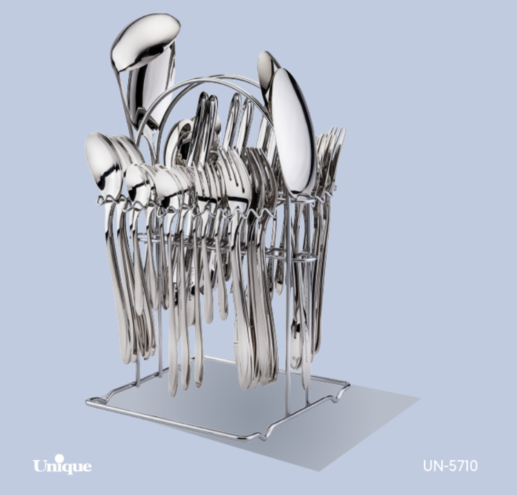 مدل UN-5711 دارای یک استند زیبا و کاربردی است که به شما امکان میدهد قاشق و چنگالها را به صورت مرتب و سازماندهی شده نگهداری کنید. این استند نه تنها به نظم و زیبایی کمک میکند بلکه دسترسی سریع به قاشق و چنگالها را نیز فراهم میسازد.