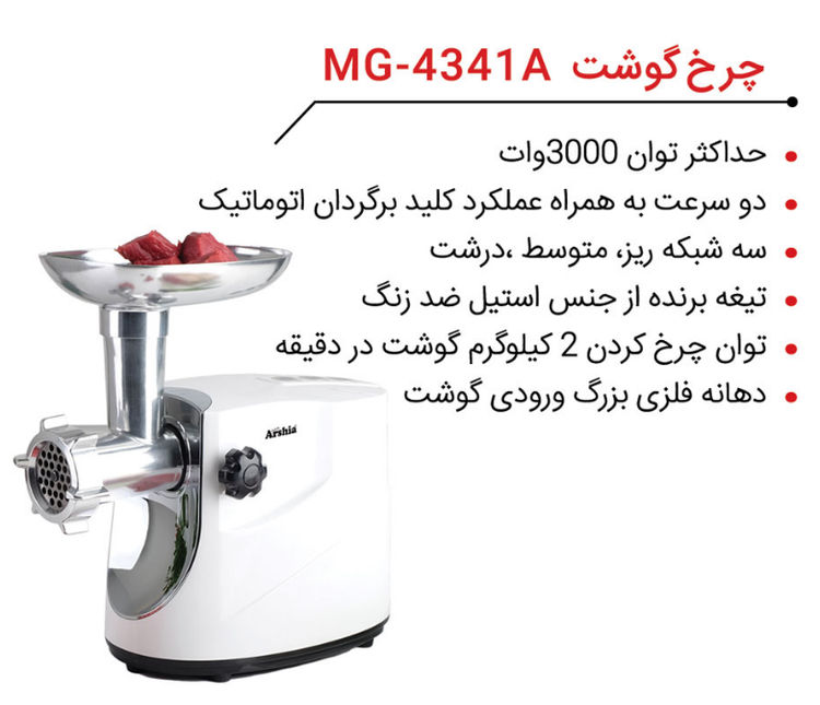این چرخ گوشت ارشیا MG-4341A نیز مانند سایر محصولات شامل گارانتی معتبر و با بهترین کیفیت و قیمت در میان سایر چرخ گوشت های های ایرانی عرضه میگردد.